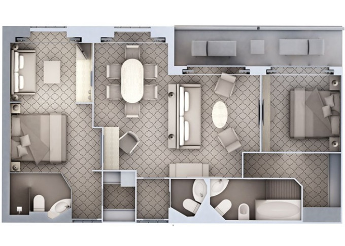 | R2 - Royal Suite 2 96 m² (vrátane 2 balkónov 16,5 m² spolu). 6. paluba. Max 6 osôb. | 105 000 € 105 000 € za osobu |