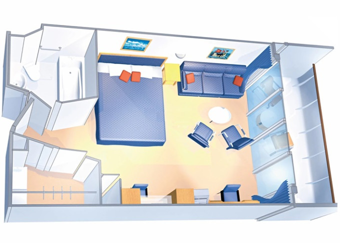 VP - Ocean View Panoramic Suite (bez balkónu) 37,5 m². Celoplošné neotvárateľné okná. 12. paluba. Oddelená časť s poschodovou posteľou. Max 6 osôb. Výhody Suite. 9 408 € 4 704 € za osobu