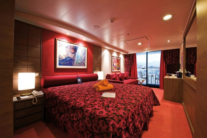 Suite s balkónom: cca 31m² kajuta s manželskou posteľou (na požiadanie 2 oddelené postele) a rozkladacia pohovka. Klimatizácia, kúpeľňa s vaňou, toaletný stolík, priestorná skriňa, interaktívna TV, telefón, minibar, sejf, sušič na vlasy. Balkón so stolíkom a stoličkami. Internetové pripojenie (za poplatok).