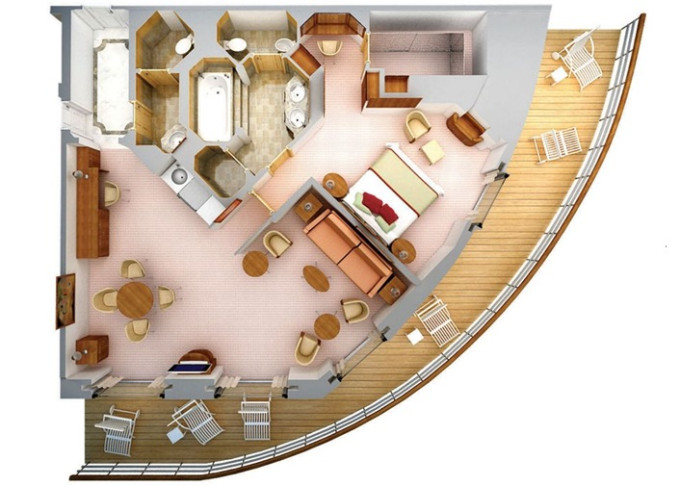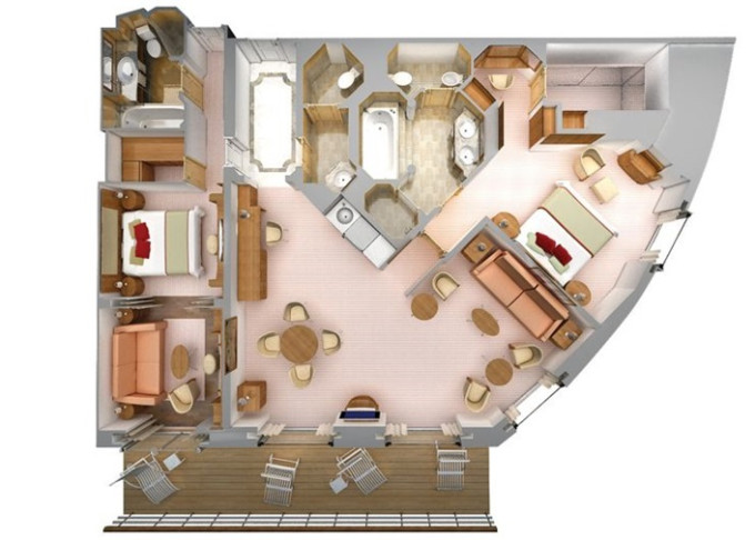| R2 - Royal Suite 2 127 m² (vrátane 18 m² balkónov). Royal Suite prepojená s Veranda Suite. 7. paluba vpredu. Max 5 osôb. | 49 400 € 24 700 € za osobu | ||